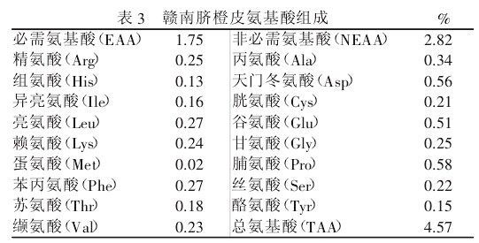 由表3可知,赣南脐橙皮的必需氨基酸含量为1.75%,其中蛋氨酸含量较低,仅为0.02%;非必需氨基酸含量为2.82%。