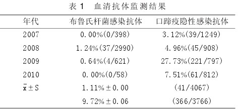 由表1可知,布鲁氏杆菌病感染抗体平均阳性率为1.11%±0.00,口蹄疫隐性感染抗体平均阳性率为9.72%±0.06。经统计学分析,4年间布鲁氏杆菌病阳性率2007年与2009年相比差异显著(P<0.05),2008年显著高于2007年(P<0.05),2008年与2009年差异显著(P<0.05),2009年与2010年差异不显著(P>0.05)。口蹄疫隐性感染抗体2007年与2008年、2009年、2010年;2008年与2009年、2010年;2009年与2010相比年差异均极显著(P<0.01)。2009年隐性感染抗体阳性率。