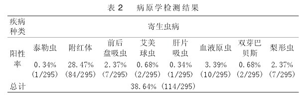 对采集的295份病料,运用寄生虫及RT-PCR方法进行病原学检测,结果如见表2。