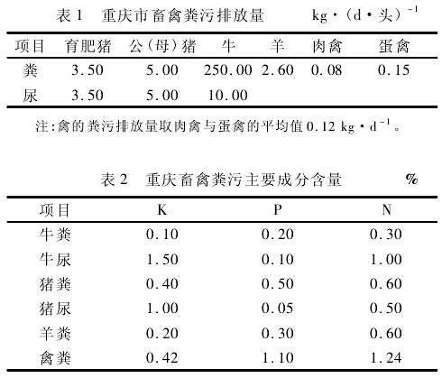 对重庆市所辖37个涉牧区(县)2008—2012年饲养的猪、牛、羊、家禽粪污排放量进行测算,并根据重庆市以及各区县的耕地数量,以市、功能区为对象分别进行畜禽粪污排放量及耕地对粪污主要成分(N、P、K)承载量的时空分布分析。