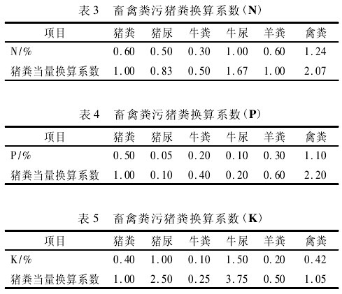 耕地畜禽粪污承载量包括两层含义。一是经计算的各畜禽粪污总量若用重庆市所有耕地进行消纳承载的负荷量,称为未换算粪污承载量。二是由于不同类型的畜禽粪污主要成分(N、P、K)含量差异较大,故农田对各主要成分(N、P、K)消纳量也有很大的差异,如不加区别地随意叠加统计所获单位面积畜禽粪污负荷量,即使数量相同,但因类型不同而产生的实际效果也不同;因此根据各类畜禽粪污的主要成分含量和猪粪相应成分含量进行换算,将各类畜禽粪污主要成分含量统一换算成猪粪当量值分别进行计算,分析各畜禽粪污中以各种成分(N、P、K)为基准的农田畜禽粪污染负荷量,称为换算粪污承载量。各粪污主要成分(N、P、K)的换算系数见表3、表4、表5。未换算粪污承载量=各畜禽粪污总量/耕地面积;换算粪污承载量=经换算成猪粪当量的粪污成分(N、P、K)总值/耕地面积。