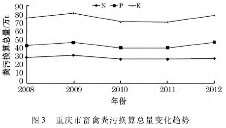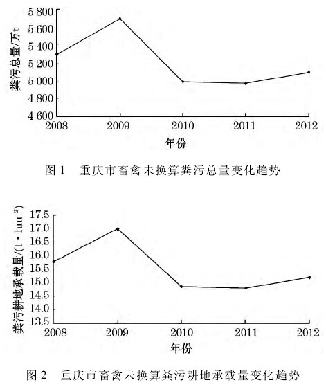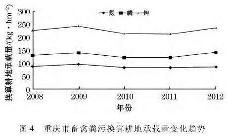 通常来说,在耕地数量不变的情况下,畜禽粪污产量、畜禽粪污耕地承载量均与畜禽饲养量有关。从图1、图2可以看出,2010—2012年重庆市畜禽粪污产量及耕地承载量在小幅降低后有逐渐增加的趋势,但较2008—2009年均有明显降低,这与2009年后重庆市畜禽散养减少较快,畜禽规模养殖在2010—2012年取得逐步发展的实际情况相符。