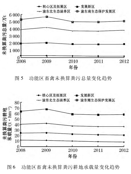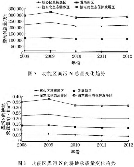 从图7、图8可以看出,N在各功能区的总量以及耕地承载量在2008—2012年间的变化趋势与图5、图6中畜禽粪污总量及各功能区的耕地承载量变化趋势相似。且主要功能区粪污氮总量排名顺序与未换算粪污总量以及粪污耕地承载量的顺序一致,即渝东南生态保护区总量最高、核心区及拓展区总量最低,这与目前重庆市畜禽养殖的数量分布、排名相符。