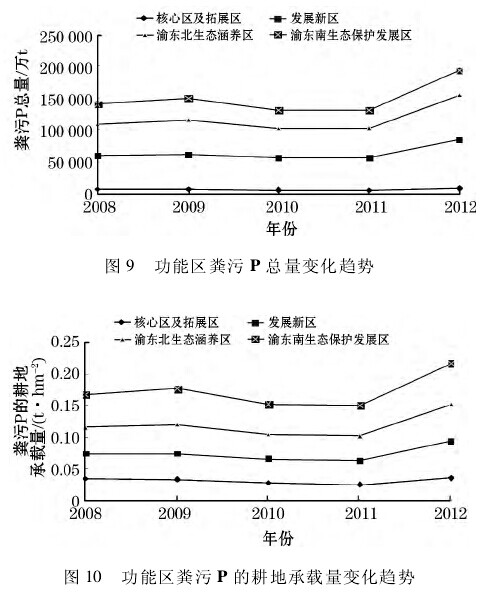 从图9、图10可以看出,P在各功能区的总量以及耕地承载量在2008—2011年间呈现逐渐下降的趋势,但到2012年均有不同程度的增加,且增加较为明显。可能与家禽粪污中P含量相对较高,且2012年各功能区家禽的生产量增加较快有直接关系。