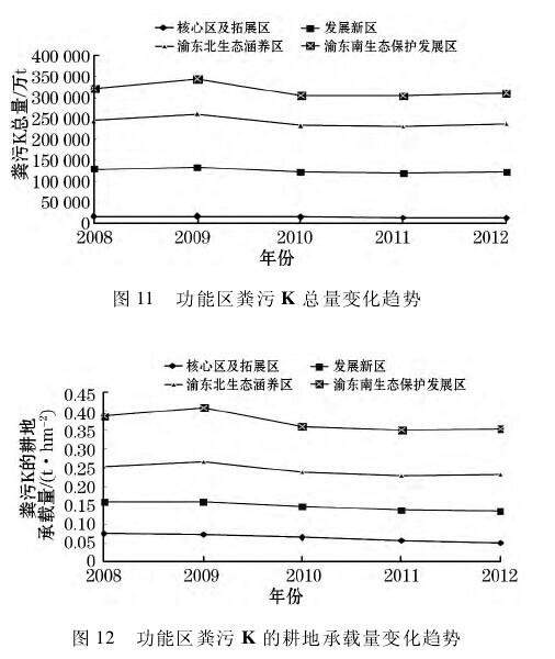 从图11、图12可以看出,除渝东南生态保护区和渝东北生态涵养区畜禽粪污中K总量及耕地承载量在2012年有增加的趋势外,其他各功能区畜禽粪污中K总量及耕地承载量总体呈现下降的趋势,这与畜禽粪污中K含量比N、P含量偏低,钾在草食牲畜粪污中含量相对较高,而近两年渝东南生态保护区和渝东北生态涵养区草食畜禽发展较快有较大关系。