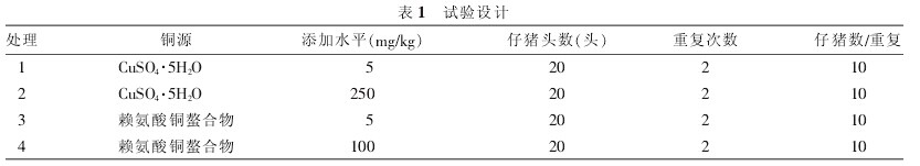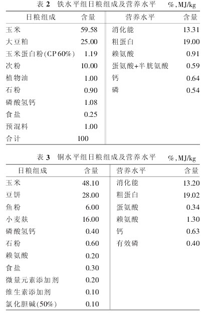 1.3 试验材料 铁水平组试验材料为硫酸亚铁和酵母铁,铜水平组试验材料为赖氨酸铜螯合物和 CuSO4·5H2O。铁水平组和铜水平组所需材料均由青岛科德饲料有限公司提供。