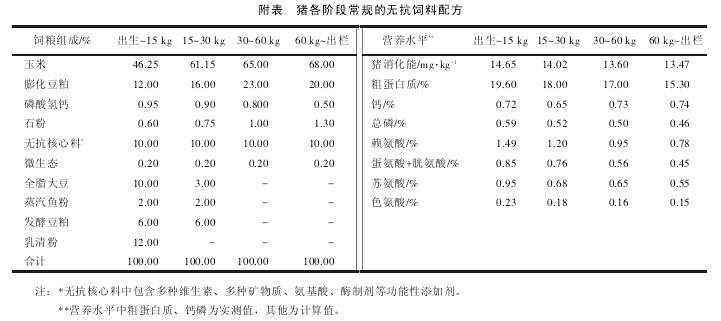 生产无抗饲料是一些大型饲料企业追求的方向,目前一些企业在猪饲料配制中已经开始减少或不添加抗生素,而是改用添加微生态制剂或中草药及各种提高适口性和消化的功能性添加剂。为了便于运输和销售,饲料企业除了生产教槽料是以粉料为主外,其他的全价料基本上是以颗粒形式包装出售。因此,要生产无抗饲料,微生态制剂一般都是选用耐高温的菌种或者是通过包被技术以减少通过高温蒸汽带来的损失。猪各阶段常规无抗配方见附表。
