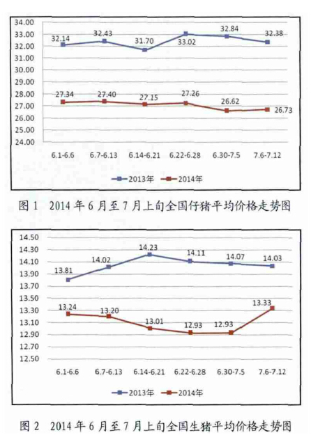 2014年6月至7月上旬,全国仔猪价格总体表现较为平稳,7月上旬出现小幅下滑,从6月底的27.26元/kg下滑到本统计结束时的26.73元/kg,下滑幅度为1.94%。