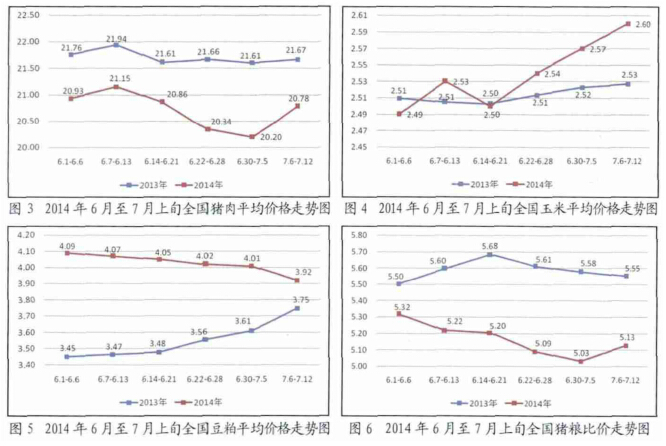 2014年6月至7月上旬,全国猪肉价格总体呈现涨跌互现的态势,7月份第1周猪肉价格最低,表现为20.20元/kg。7月份第2周有所上扬,表现为20.78元/kg,上扬幅度为2.87%,但2014年同期的猪肉价格总体上较2013年低。在全国玉米平均价格方面,2014年6月至7月上旬的玉米价格总体呈现步步上扬态势,至7月份第2周,已上扬至2.60元/kg,环比上扬1.17%。除6月第1周价格低于2013年同期及第3周价格与2013年同期基本持平外,其余各周均高于2013年同期水平。