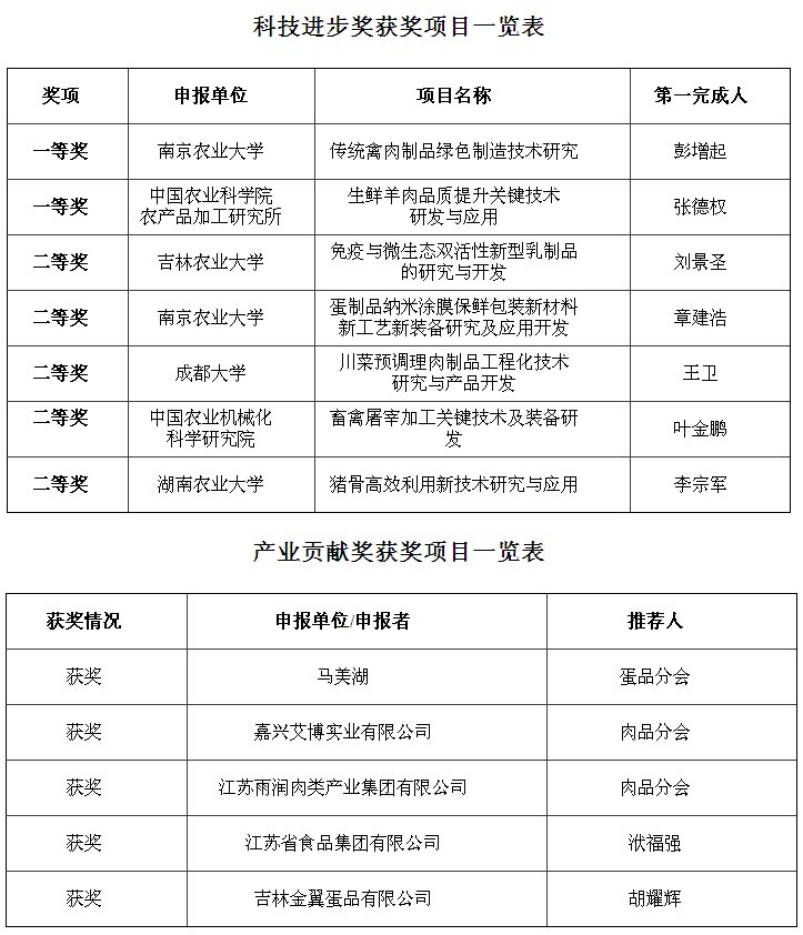 根据《中国畜产品加工研究会科技贡献奖奖励暂行办法》,本着“公开、公平、公正” 的原则,2014年度中国畜产品加工研究会“科技贡献奖”评选工作已顺利圆满地完成,分别评出“科技进步奖”7名,“产业贡献奖”5名,现将评奖结果及获奖项目基本情况进行公示(排名不分先后),具体情况见附件: