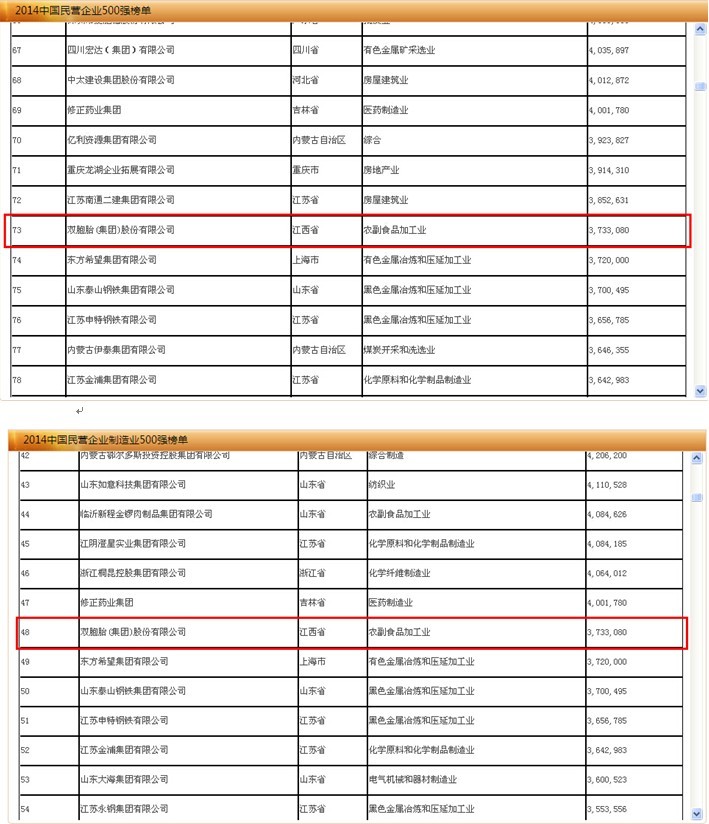 2014年8月18日,全国工商联发布“2014年中国民营企业500强”,同时发布《民营企业调研分析报告》。双胞胎集团以373亿元销售收入,位居中国民营企业500强第73名,位居中国民营企业制造业500强第48位,排名较去年都有不同程度的上升。排名位列江西省民营企业第一名。