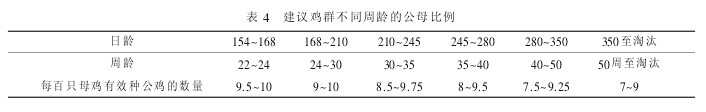 2.5每周应检查公母比例为保持整个产蛋期的受精率,每个鸡群都应需要最佳数量、交配活跃的种公鸡。随鸡群周龄的增长及产蛋率的下降,应逐渐减少公鸡的数量以维持正常的受精率,据种公鸡体况与体重的评估情况,任何不交配、不活跃的种公鸡都应淘汰以保持推荐的公母比例(如表4)。由于环境温度较高,鸡群的交配活跃性较低,因此对于采用开放式产蛋鸡舍的种鸡群来说,公母比例可适当提高一点。被保留的种公鸡应具有比较高的体重均匀度、体况无异常(比较机警和活跃)、腿部和脚趾挺直强壮、羽毛覆盖良好;较好的、向上的站姿;肌肉结实,背部平直,胸骨正常不变形弯曲;鸡冠、肉髯以及肛门的状态显示有良好的交配活跃性。从鸡群中淘汰不活跃的种公鸡应是一个渐进的过程,一次性淘汰大量的种公鸡会造成不必要的应激。