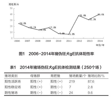 检测了250个猪场5629份血清,采用美国IDEXX试剂盒进行伪狂犬野毒gE抗体鉴别诊断。其中血清阳性率39.6%(2084/5629),比2013年上升了8.6%(图1)。90.4%(226/250)的猪场伪狂犬野毒gE抗体检测结果呈阳性(表1)。