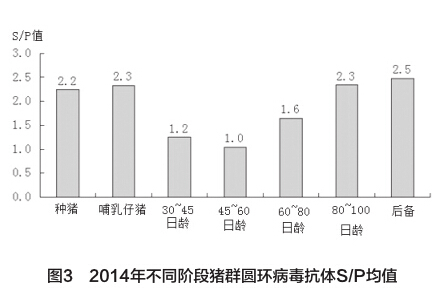 在293份血清中,抗体阳性率90.4%(韩国金诺试剂盒),详情见图3。其中种猪群抗体S/P均值2.2,变异系数C.V=47.8%,有14%的种猪抗体S/P值>3.0(偏高)。6%的仔猪(30~80日龄)抗体S/P值>2.5(偏高)。