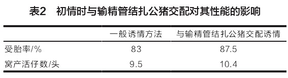 母猪在24~26周龄(170~190日龄)时开始进行公猪刺激,诱情的方法可以参考初情诱导阶段的生育管理。这项工作完成后,正常情况下,超过70%的后备母猪将在3周后出现1次发情未配,6周后将有95%以上后备母猪至少出现1次发情未配。对未发情母猪采取“禁食、并栏、运动”等应激源刺激发情。1~2次发情阶段时最好使用结扎的公猪诱情并交配,可以增加母猪后续人工授精的配准率、提高产仔数(表2)。