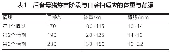 采取炼苗限饲方案时,建议在母猪第3次发情时为其配种,所以炼苗限饲时间为2个情期+7 d。每天参考采食量为2.5~2.75 kg,炼苗限饲期饲喂量以维持日增重600~700 g为标准。此阶段仅限饲能量,需要添加青饲料、生殖营养、肠道营养,以保持饲料体积、维持肠道容积,促进生殖器官、肠道的发育。控制母猪此阶段的膘情和增重,可供参考的指标如下(表1)。