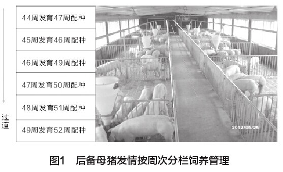 为了方便统一管理配种,建议规模大的猪场根据周节律将发情母猪分栏管理,如图所示(图1),整栋配怀舍中所有在44周发情的,都赶在第1栏,47周配种;所有在45周发情的,赶入第2栏,48周配种……以此类推,便于集中管理,提高效率。