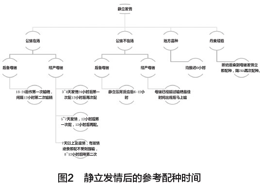 2)公猪查情2次/d。母猪发情可分为3个阶段:即第一公猪期,此期公猪可以刺激母猪产生静立反应,但配种员则不能;配种员期,此期即使公猪不在场,配种员压背可以引起母猪静立反应;第二公猪期,此期母猪配种员压背没有静立反应,公猪刺激才有静立反应。当每天只进行1次公猪查情时,可能有相当一部分母猪是表现为处在第二公猪期,再按图2推荐的时间配种不合适。