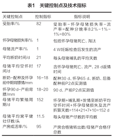 现有一规模化仔猪生产场,采用自动送料、环境自动控制设施,年初确定PSY为26头,现拟定一个控制方案。根据PSY(头均母猪年提供商品猪数)=年产胎次×窝平健仔数×产房成活率的公式,首先对生产目标进行分解。年产胎次为2.4胎、窝平健仔为11.5头、产房成活率为95%。
