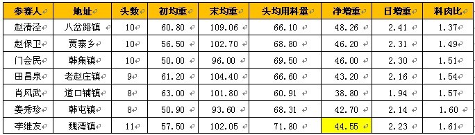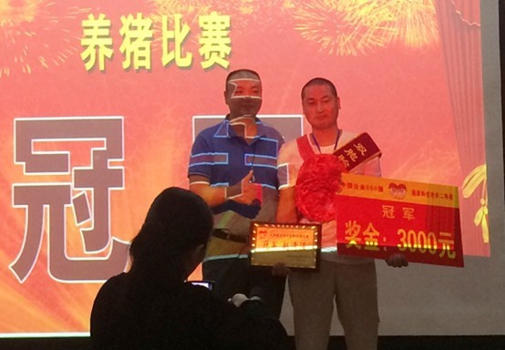 今年7月份,双胞胎集团在聊城举办仔猪料养猪比赛,吸引了聊城近100家猪场参赛。赵清泾抱着试试看的态度也参加了此次的双胞胎仔猪料养猪比赛。赵清泾以10头乳猪参赛,初均重60.8斤,经过20多天的精心饲养,末均中达到了109.06斤,净增重48.26斤,日增重2.41斤,料肉比达到了1.37:1,在近百名参赛者中获得了第一名。比第二名的参赛者料肉比1.37高出0.12。