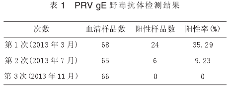 从检测结果来看,实施综合防控等净化方案以来,猪群gE野毒抗体的阳性率由首次检测的35.29%降至第3次检测的0%(见表1),说明猪群伪狂犬病野毒抗体逐步转阴,净化初步成功。