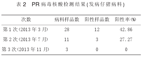 2013年3月以来,选用优质高效的某公司的猪伪狂犬病基因缺失弱毒疫苗(gE、TK基因缺失)进行全群免疫。仔猪3日龄内滴鼻免疫,8~9周龄再肌注免疫1次;种公母猪每3个月普免1次,后备母猪配种前免疫2次。