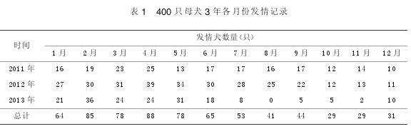 当犬只怀孕时,转移至产房并记录,统计所有种母犬2011-2013年连续3年的怀孕记录;选取100只母犬,统计1年中再次发情犬的数量及发情间隔时间。