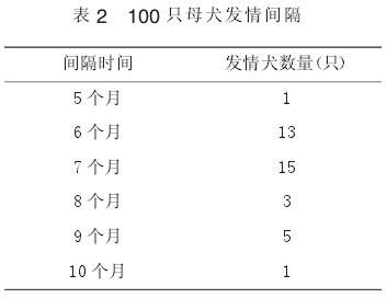 由表2可知,100只母犬在1年中重复发情的有38只,重复发情间隔以6-7个月的犬最多。