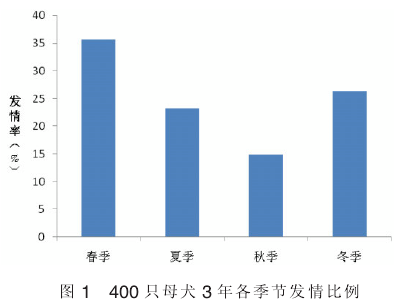 从统计结果来看,比格犬发情的数量春季最多、秋季最少;2011年整体的发情率为49.75%,2012年为75.50%,2013年为46.00%,种犬的发情率还有待提高。可通过增强营养,补充矿物质和维生素,改善饲养环境,加大运动量等方法提高种母犬的发情率。