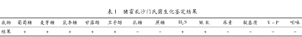 无菌操作取病死猪肝、脾等病料接种琼脂培养基,37℃培养24h,可见针尖大小、边缘光滑、湿润、半透明菌落。取典型菌落接种生化鉴定管,37℃培养18~24h,生化实验结果与沙门氏菌检验标准符合。见表1。