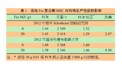 良好的结果已经在玉米-豆粕型肉鸡日粮中添加FramelcoFraE-line产品(复合酶制剂产品)实现了。在荷兰,向最高密度日粮中添加此复合酶产品,总体生产性能2.47%;而在匈牙利,向低密度日粮添加后,生产性能提高高达8.5%(表1)。