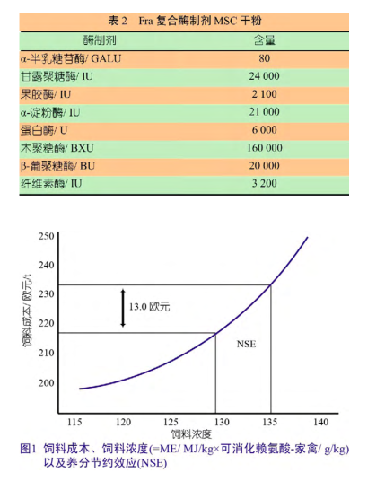 现在我们必须超越传统营养。传统的观念是饲料要配制成高浓度、低成本的日粮。现在,配制的低浓度、低成本的饲料创造了一项能够将低养分密度饲料的健康益处与能够维持良好畜牧学性能的复合酶系统结合起来的实用方法。由复合酶系统(FramelcoFraE-line酶制剂)引起的生物学过程,能够让饲料中更多的能量和氨基酸为动物利用。这被称为养分节约效应(NSE),归因于可以配制低浓度饲料的酶系统(表2)。