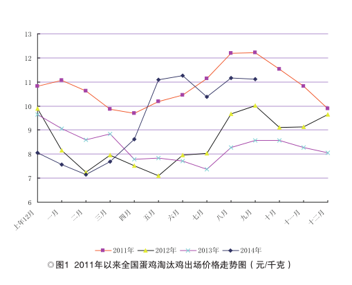 1.禽蛋价格淡季逆势上涨屡创新高,蛋鸡“身娇蛋贵”。7月以来,全国鸡蛋价格上涨明显,尤其进入8月后,涨势有所加速,鸡蛋价格不断创下历史新高。全国监测数据显示,8月25日鸡蛋全国平均出场价格一度达到5.48元/500克,不少地区鸡蛋最高零售价格一度飙涨至7元/500克,几乎是一天一个价,涨得连蛋商都觉得“惊人”。2014年前三季度全国淘汰鸡平均出场价格9.56元/千克,比2013年前三季度的8.23元/千克高出1.33元;其中:8月均价最高,达11.16元/千克;2月均价最低,仅7.16元/千克。2014年前三季度全国鸡蛋平均出场价格为8.67元/千克,比2013年前三季度的7.63元/千克高出1.04元;其中:8月均价最高,达10.34元/千克;2月均价最低,仅6.94元/千克。