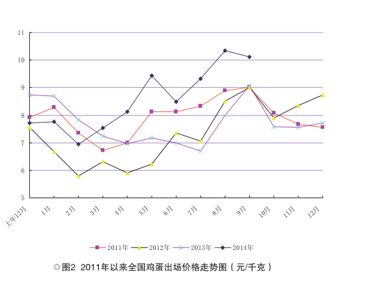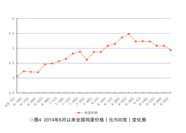中秋、国庆是我国鸡蛋传统消费旺季,受到月饼消费和学生开学备货等因素影响,9月鸡蛋消费特别旺盛,加之蛋鸡存栏量较低,鸡蛋供不应求,从而导致2014年鸡蛋价格屡创历史新高,主产区最高价格达到5.8元/500克。综合分析,2014年蛋价屡创新高的主要原因是受此前流感后遗症影响。