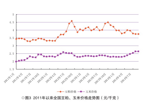 3.玉米价格高,养殖利润缩减。2014年4月中旬以来,得益于国家临储政策垫底,生猪价格逆市反弹,鸡蛋价格高涨,玉米行情持续升温,8月下旬玉米现货价格已涨至2800元/吨左右,突破2009年以来的历史最高水平。随着玉米价格上扬,饲料价格也不断上涨,2014年以来,豆粕价格虽有回落,但仍处于较高水平。因此,面对当前生猪价格和鸡蛋价格齐头并进的利好形势,许多养殖户在欣喜之余略显惆怅,因为高涨的玉米价格正在严重侵蚀着畜产品价格上涨带来的利润空间,养殖业依然处于亏损边缘。2014年前三季度全国玉米价格平均为2.43元/千克,比2013年同期的2.34元/千克高0.09元;9月25日为2.69元/千克,比2013年同日的2.36元/千克高0.33元。2014年前三季度全国豆粕价格平均为3.86元/千克,比2013年同期的4.16元/千克低0.30元;9月25日为3.64元/千克,比2013年同日的4.46元/千克便宜0.82元(图3)。2014年9月第3周全国肉鸡配合饲料和蛋鸡配合饲料平均价格分别为3.48元/千克和3.21元/千克,同比分别上涨1.5%和1.9%。
