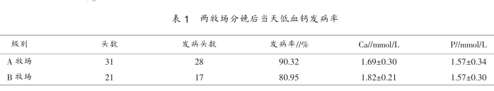 奶牛血浆钙浓度正常应在2.00mmol/L以上,当奶牛血浆钙浓度低于正常值时,一般认为奶牛患低血钙症,与此同时血浆中磷浓度也相应降低。表1显示了两奶牛广场在分娩当天发生血浆钙磷浓度降低的发病情况。