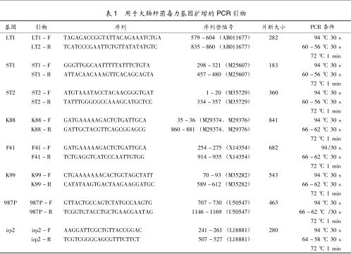 在GenBank中已发表的大肠杆菌毒素、菌毛、毒力岛基因序列分析比较的基础上,参照文献[15]分别设计ST1、ST2、LT1、K88、K99、987P、F41和irp2等7对特异性引物,预期扩增出的目的片段大小分别为183、360、282、841、543、463、682和280bp。引物由上海生物工程技术服务有限公司合成,浓度均为50mmol/L。引物序列见表1。