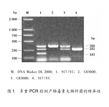 以3对引物ST1、ST2、LT1(浓度均为50mmol/L)混合,以标准DNA为模板进行多重PCR扩增,结果从携带ST2、LT1、ST1大肠杆菌S17/YC株能扩增到预期约360、282和183bp的片段,从携带ST2和LT1大肠杆菌C83600株可扩增到预期约360bp和282bp的片段,均与预期大小一致(图1)。这表明该PCR方法能够特异性鉴ETEC。