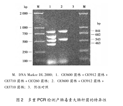 以4对引物K88、K99、987P、F41(浓度均为50mmol/L)混合,以K88+、K99+、987P+、F41+,大肠杆菌混合DNA为模板进行多重PCR扩增,结果从标准菌株C83600(ST2+/LT1+/K88ac+)、C83912(K99+)、C83710(987P+)、C83260(F41+)分别扩增到841、543、463和682bp特异性片段,与预期大小一致(图2);而从其他菌株均不能扩增到预期片段。表明用混合引物建立的多重PCR可用于K88+、K99+、987P+、F41+大肠杆菌菌毛类型的鉴定。