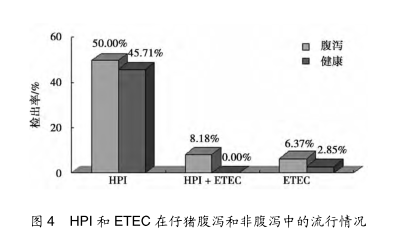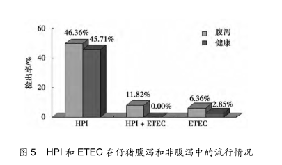 对临床35份同年龄段的健康仔猪样品快速检测表明,编码高分子量蛋白质的基因irp2也有很高的检出率,占42.86%(15/35),ST2也有5.71%(2/35)的检出率。然而未检出ST1、LT1、K88、K99、987P、F41基因。比较还发现,健康新生仔猪的大肠杆菌中,只携带HPI毒力岛的大肠杆菌占45.71%,ETEC占2.85%,ETEC并发HPI感染的占0%(图5)。