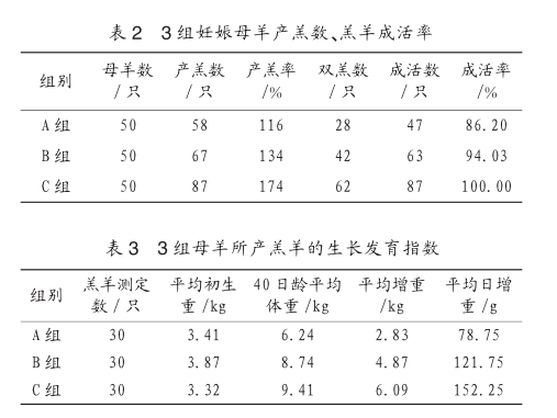 从表2中可以看出,羔羊产羔数A组58只、B组67只、C组87只,双羔数A组28只、B组42只、C组62只,产羔率分别为116%、134%和174%。C组比A组多产29只,比B组多产20只。C组生产性能明显高于A组和B组。