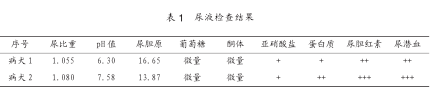 病例1患犬,尿色深黄,尿比重升高,尿蛋白(+)、尿潜血(++)等异常。