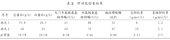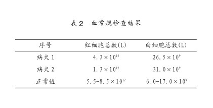 两例病犬都出现红细胞总数下降、白细胞总数上升的现象。结果见表2。