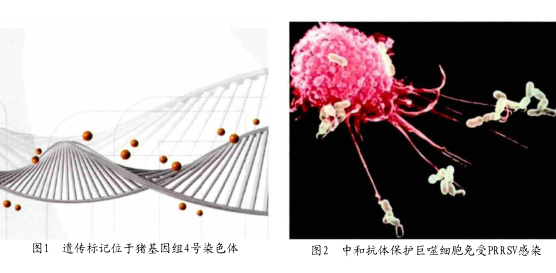 新型防控PRRS的方法兼顾了遗传学和免疫学理论。2001年美国成立PRRS与宿主遗传学联合会,同时相关文章被发表,确定了猪体内的一些基因标记可用来改善PRRS感染后的症状,并能降低病毒血症。这些科学成果有利于帮助养殖场主提高猪的育种水平,遗传标记位于猪基因组4号染色体(图1),带有该标记的猪体内的病毒滴度相对更低,体重增加的概率相对更大。如果带有有利的基因标记,猪只可以增重10%,同时降低10%的病毒感染概率。这在美国是非常显著的提高。另外,同时监测与死亡率相关的遗传标记。PRRS会引起猪的死亡率上升,达到50%。PRRS和猪呼吸道综合征(PRDC)混合感染,会加剧呼吸道综合征的感染率。猪呼吸道综合征相关感染的死亡率是与病毒血症相关的,而在猪基因组1号染色体上有一个遗传标记与死亡率相关,如果没有此不利的基因标记,猪是受保护的;如果带有这个不利的基因型标记,猪的死亡率能达到42%。同时,PRRS与宿主遗传学联合会也监测与免疫相关的基因标记,寻找尤其能增强免疫反应的基因标记,此基因标记可以增加猪只的体重,降低死亡率。