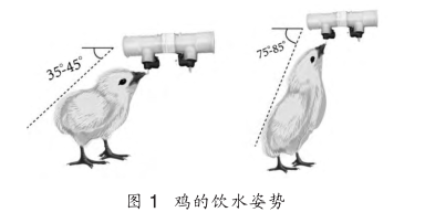 鸡最舒服的饮水姿势是身体站立,抬头,使水正好流进喉咙。您可以通过调整饮水乳头的高度来控制。对于1周龄雏鸡,喙和饮水乳头的最佳角度是35~45°,大于1周龄的雏鸡,喙和饮水乳头的最佳角度是75~85°(见图1)。