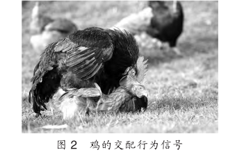 鸡有求偶与交配的行为。在自然交配时,公鸡在交配前首先会表现出求偶行为信号,如俯身跑向母鸡,单脚触地并单侧展翅围着母鸡旋转以示求爱。此时如母鸡愿意接受交配则会半展翅并快速蹲下,公鸡即很快登上其背,以喙啄着母鸡头部的羽毛,再垂下尾部使两性生殖孔相接,公鸡即迅速射出精液,然后从母鸡背部下来,并再次围着旋转1~2次。母鸡接受交配后立即站起并抖动身体,然后离去(见图2)。