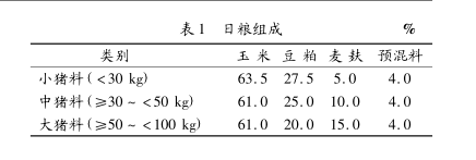 试验分两组进行,杜可杂交猪和约长大三元猪仔猪各12头,每组分小群饲养,每群4头。所有猪在同一幢猪舍内饲养,试验期间不作圈舍调整,按正常免疫程序注射猪瘟、猪丹毒、猪肺疫三联苗和猪副伤寒苗,驱虫、编号。自由采食及饮水。试验猪的日粮采用自配育肥料,日粮组成见表1。