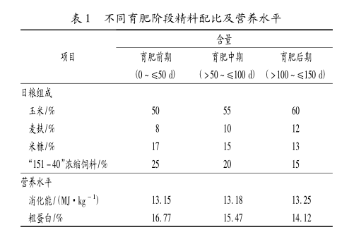 正试期分三个阶段,育肥前、中期自由采食,育肥后期的最后1个月控制精料采食,日喂全天采食量的80%,每日增加投放大叶枸或苏丹草2次,鲜喂,以九成饱为度;前期日喂3次,中、后期日喂2次;喂法为湿拌料,少投勤添,不计餐数,自由饮水;每日打扫、冲洗圈舍2次,由同一饲养员专门饲喂。