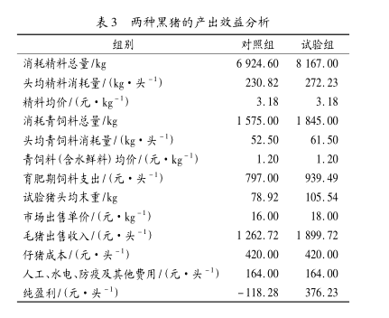 试验过程中,精料按均价3.18元/kg计算,青饲料按1.20元/kg计算;鄂西黑猪和杜太黑猪的市场出售单价分别为16元/kg和18元/kg,由于鄂西黑猪肥膘过多,瘦肉率只有41%[1],而杜太黑猪瘦肉率在52%左右[2],从而导致出售价格差异较大。通过效益分析,对照组每头平均纯盈利为-118.28元;而试验组为376.23元,一亏一赚,二者差距明显。