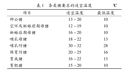 冬季由于外界环境条件恶劣,猪的抵抗力和免疫力下降,发病率和死亡率上升,造成巨大的损失。为此,在日常饲养管理中要改善猪舍小气候状况,为猪只创造适宜的环境。冬季养猪尤其要做好保温与通风工作,保持猪舍干燥,一般舍内相对湿度以50%~65%为宜。各类猪要求的适宜温度见表1。